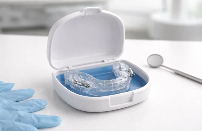 Férula dental para dejar de roncar sobre una mesa junto a un estuche, en un entorno clínico neutro.